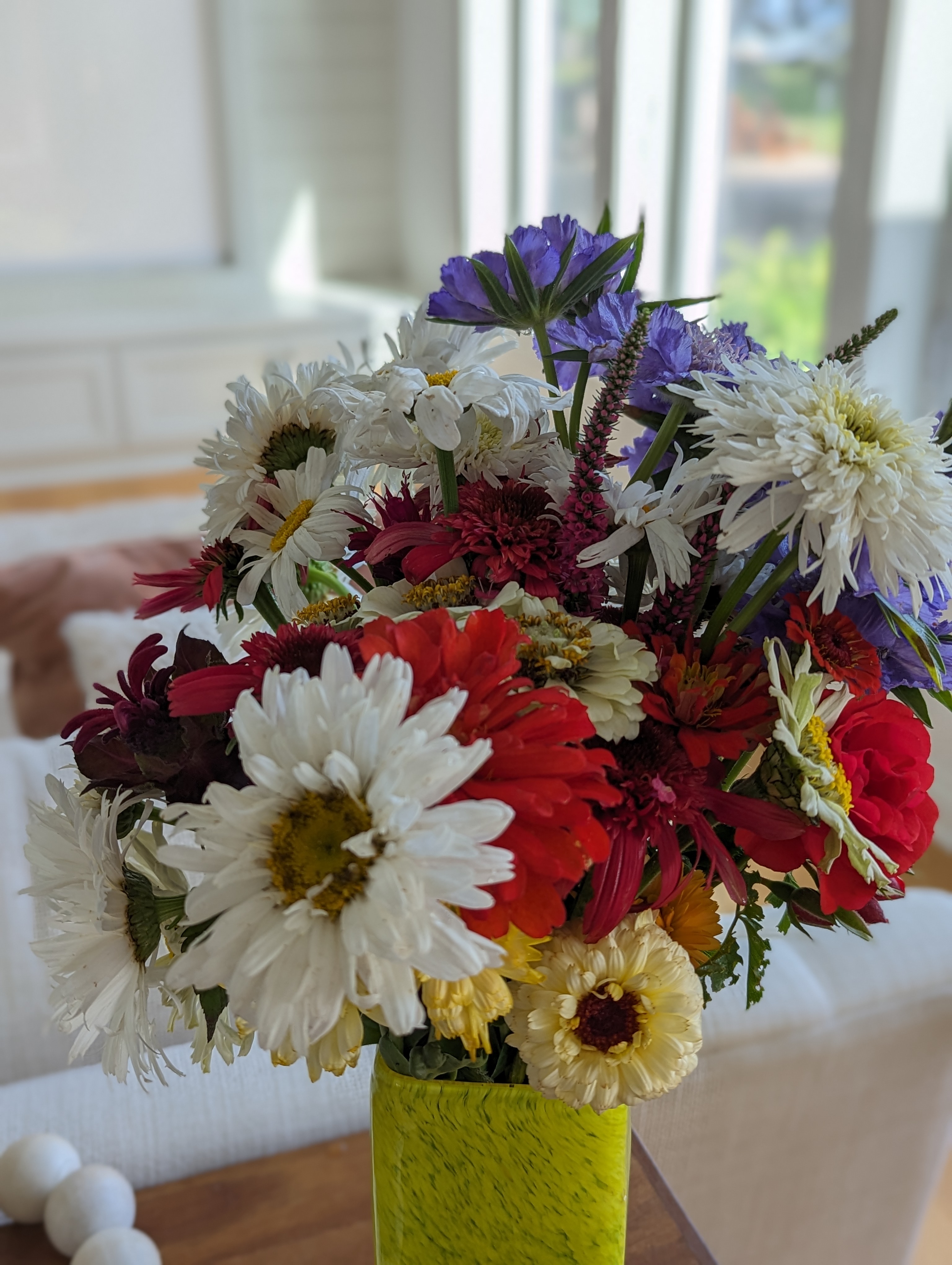 - Enjoy the Process of Creation: For me, building a bouquet at Freighter View Farms is more than just arranging flowers. It’s about savoring the creativity of the garden, being inspired by what’s blooming, and enjoying the art of putting it all together. I love gathering the flowers from the garden, laying them out on the kitchen table, and slowly piecing them together. The process is calming, a time to connect with nature, and to honor the flowers that have graced our beds through the season.