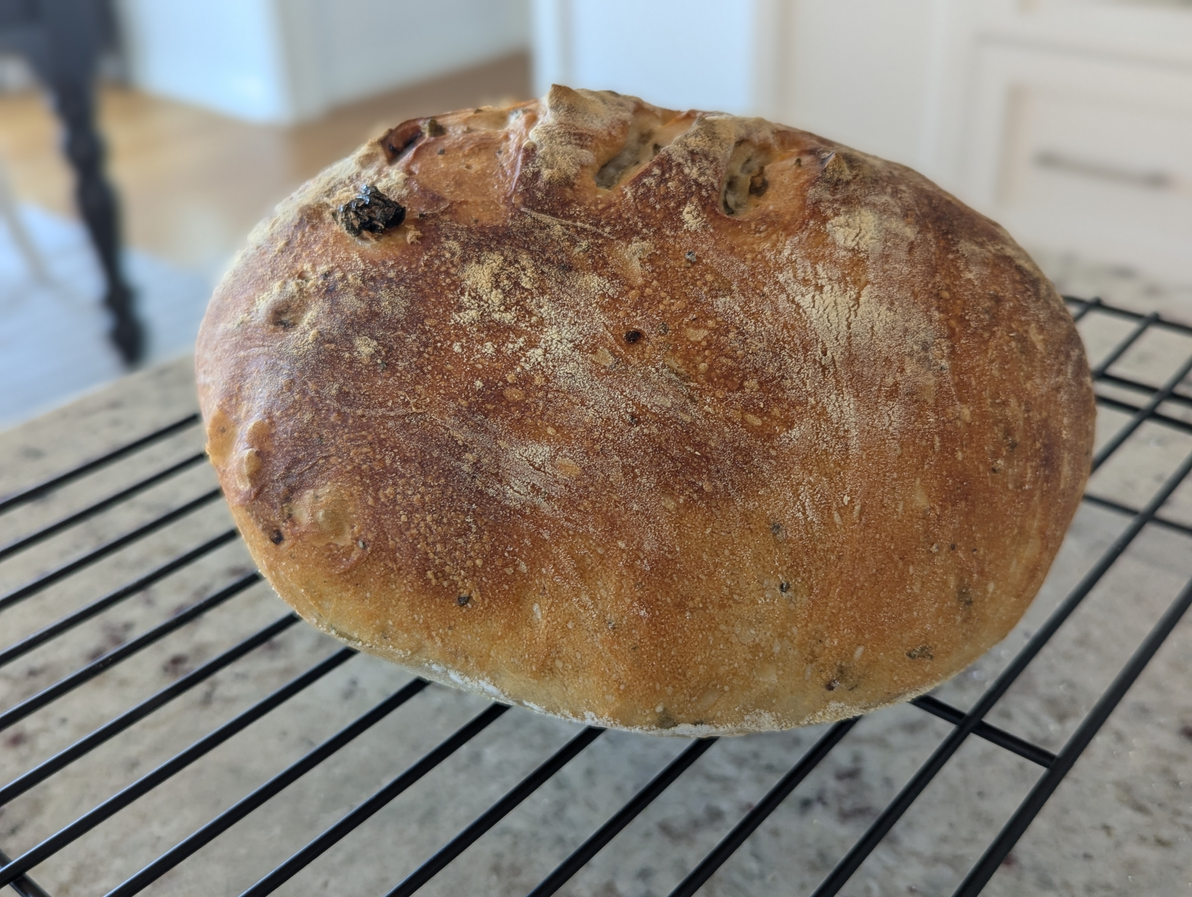 As I pulled the bread out of the oven, I was greeted with a sight that never fails to bring joy, a beautifully rounded loaf with a deeply golden crust. The aroma was intoxicating, the sweet undertones of sun-dried tomatoes mingling with the fresh brightness of basil and the warmth of black pepper.